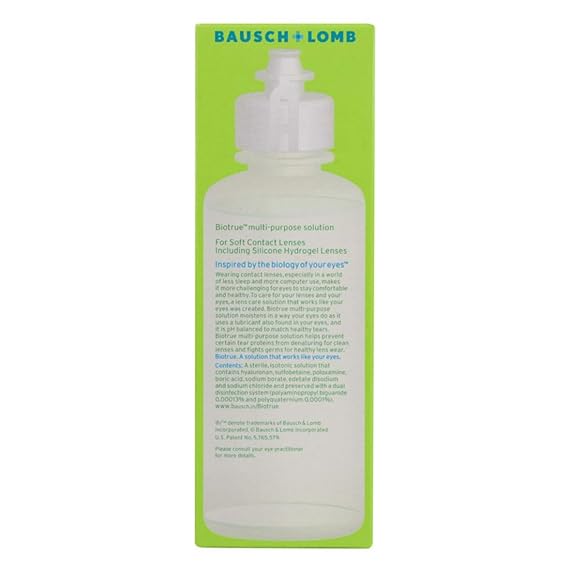 BioTrue® Multi-Purpose Solution works like the eye to help make wearing contact lenses easier, no matter what lens you wear. No other solution includes these bio-inspired innovations. BioTrue® Multi-Purpose Solution moistens by using a natural lubricant found in the eye and it is pH balanced to match healthy tears.To ensure optimal eye health, BioTrue® Multi-Purpose Solution provides unsurpassed disinfection, while maintaining beneficial proteins and removing denatured proteins.